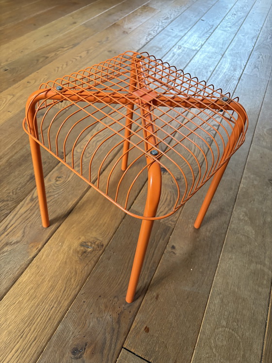 Lovely orange wire stool. Stays beautifully and intensely colored. A few scratches (as shown in the photo).