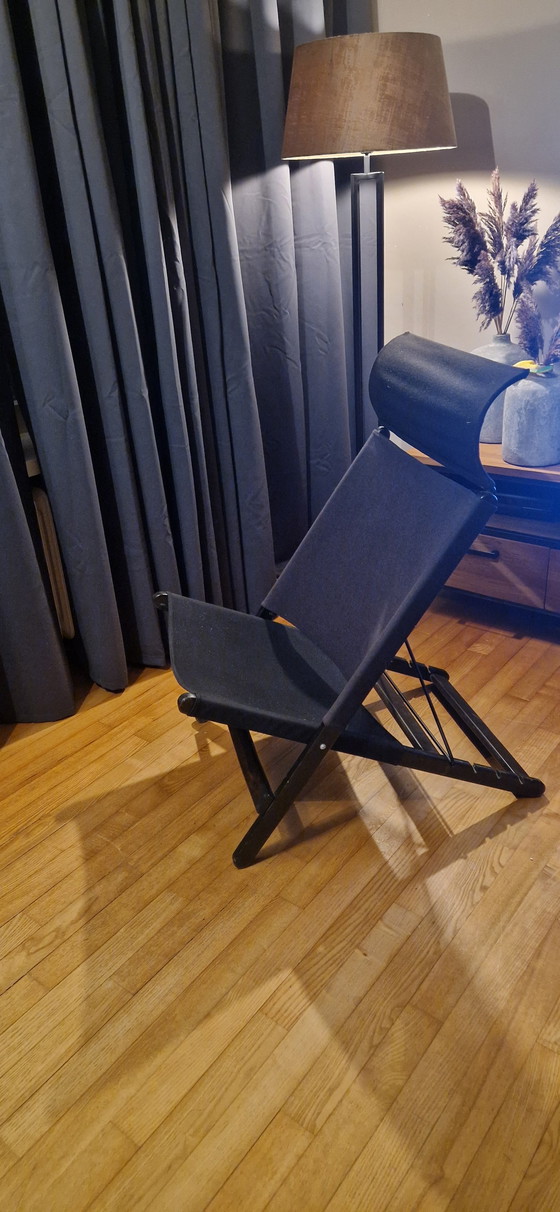 Experience the charm of days gone by with this vintage beach chair from Ikea, designed by Tord Björklund in the 1990s. A perfect combination of functionality and classic aesthetics, this chair is ideal for both indoor and outdoor use. The sturdy black wooden frame and sturdy textile seat offer both style and comfort.