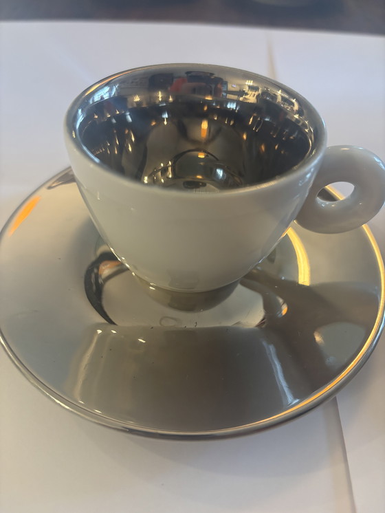 Presenting an exquisite piece from the Illy Collection 2011, this set includes one cup and two saucers, embodying a modern aesthetic with its sleek design. The pristine white porcelain cup is complemented by the reflective silver saucers, creating a sophisticated contrast that is both elegant and eye-catching.