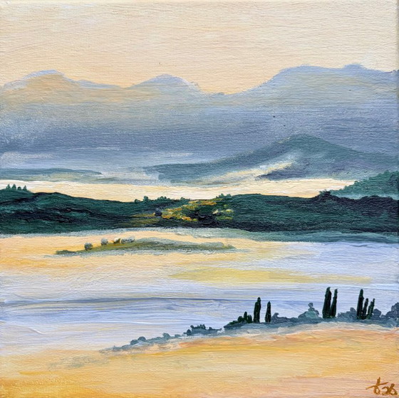 Le Crete is a small landscape painting inspired by the South of Tuscany. The hills are shrouded in mist. The clay-rich landscape casts a soft glow on the sky. Warm yellows and cool whites, while the forms blend into one another.