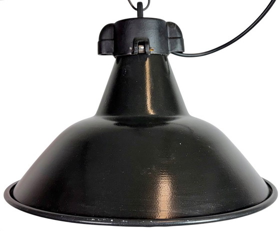 Industrial black enamel pendant light made in former Czechoslovakia during the 1950s. White enamel inside the shade. Cast iron top. The porcelain socket requires standard E27/ E26 light bulbs. New wire. Fully functional. The weight of the lamp is 2 kg.The diameter of the lampshade is 38 cm.