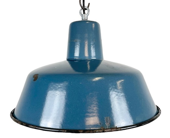 Industrial blue enamel pendant light made in Poland during the 1960s. White enamel inside the shade. Iron top. The porcelain socket requires E 27 light bulbs. New wire. Fully functional. The weight of the lamp is 0,8 kg.