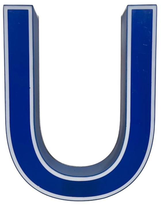 This vintage industrial blue plastic illuminated letter U was made in Italy during the 1970s and comes from an old advertising banner. It is equipped with a LED strip.The weight of the letter is 0,4 kg.