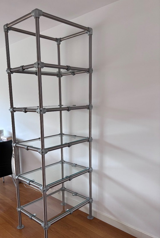 This custom-made industrial display cabinet is a perfect addition to any modern interior. With its refined chrome tubes and glass shelves, this cabinet offers not only a stylish appearance but also practical storage space for your favorite decorative pieces or collectibles. The open structure ensures that your items are visible from every angle, making it an ideal choice for displaying artwork or books.