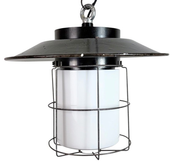 Vintage Industrial lamp made by Elektrosvit in former Czechoslovakia during the 1960s. It features a bakelite top, a gray enamel shade with white enamel interior, an iron cage and a milk glass cover. The porcelain socket requires standard E27 / E26 lightbulbs. The weight of the lamp is 2,5 kg. The lampshade diameter is 37 cm.