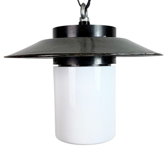 Vintage Industrial lamp made by Elektrosvit in former Czechoslovakia during the 1960s. It features a bakelite top, a gray enamel shade with white enamel interior and a milk glass cover. The porcelain socket requires standard E27 / E26 lightbulbs. The weight of the lamp is 2,2 kg. The lampshade diameter is 37 cm.