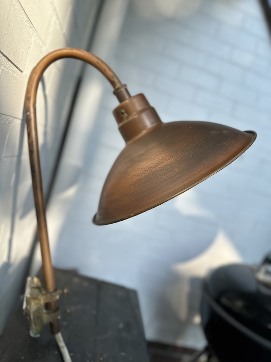 The inside of the shade is white enameled for optimal light reflection; the outside has a warm brown-copper patina. The lamp can be easily attached to a table, workbench or shelf thanks to its sturdy clamp.