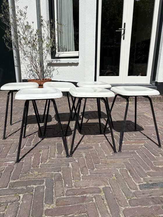 For Sale: A set of 6 vintage stools with a sleek, industrial look. The stools have a plastic seat and a black metal base.