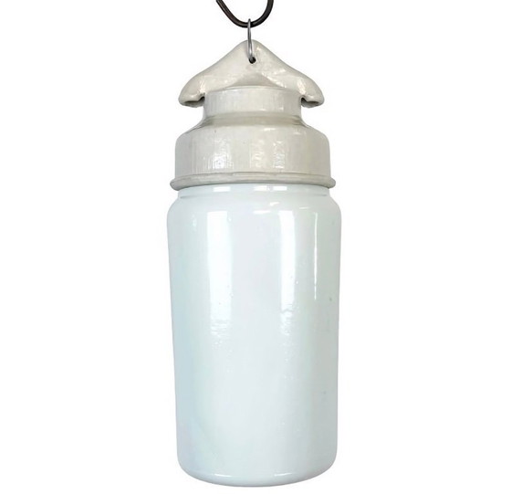Vintage industrial light made in former Soviet Union during the 1970s.It features a white porcelain top and a milk glass cover. The socket requires E27 light bulbs. New wire. The weight of the lamp is 1kg.