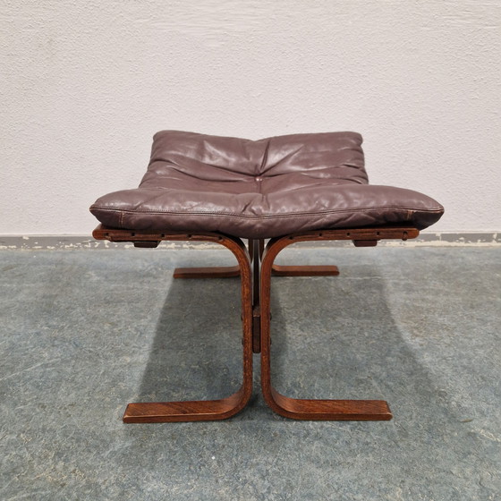 Designed by Ingmar Relling for Westnova, this vintage Siesta ottoman is a beautiful example of Scandinavian design. It has an elegant wooden frame and comfortable brown leather upholstery. The ottoman is in very clean condition. Slight slight scratches on the leather. Everything is easy to see in the pictures. Height 44 cm on the sides and center 39 cm high.