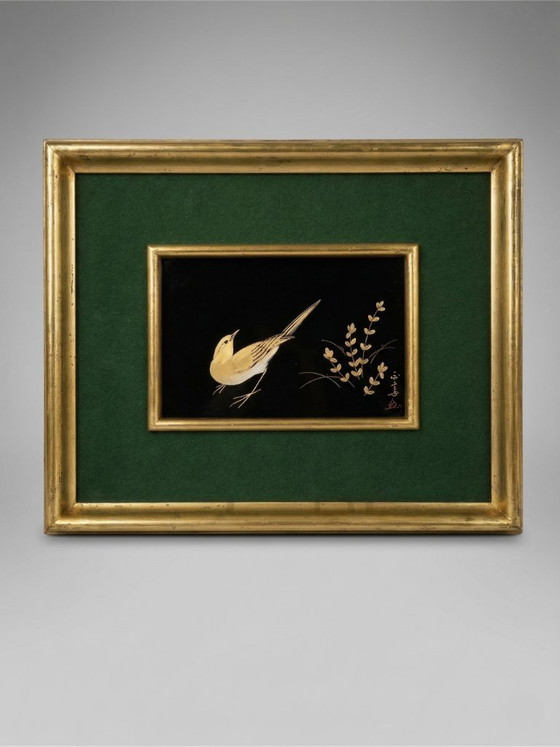 The contrast between the deep black background, the delicate gold lines, and the deep green passe-partout creates a refined composition, typical of Japanese decorative pieces intended for export in the second half of the 20th century.