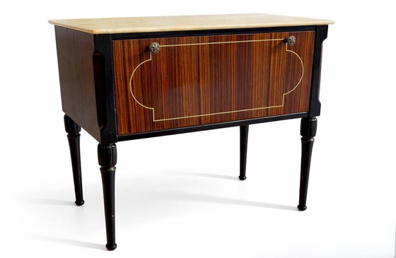 Stylistically and in its choice of materials, this pair of pieces blends harmoniously with the Italian workshops and designers who, from the late 1940s to the 1950s, combined the elegance of Art Deco with modern, clean lines. The furniture is both functional and decorative, and can also stand alone as a work of art. It is the ideal choice for interiors in the Mid-Century Modern, Art Deco, or luxurious vintage styles, where it serves as a striking yet timeless accent piece.