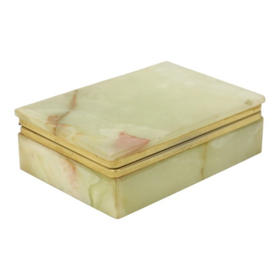 Vintage cigarette case or jewelry box made of natural onyx stone, decorated with gold-colored (copper-plated) metal fittings, Italian in origin, marked G.S.E. Ottone Garantito, circa 1960s.