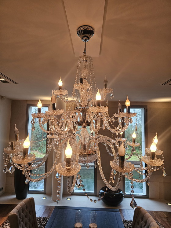 Experience the timeless elegance of this Italian crystal chandelier, a masterpiece that transforms any space into a luxurious setting. With its refined design and dazzling crystals, this chandelier captures light in a way that creates an enchanting atmosphere.