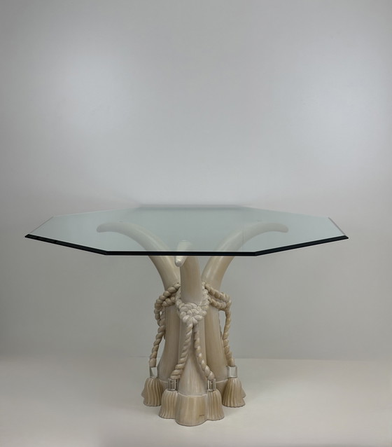Stands on three imitation cream-colored legs in the shape of elephant tusks, wrapped in cord and finished on plexiglass blocks with the original brand label.