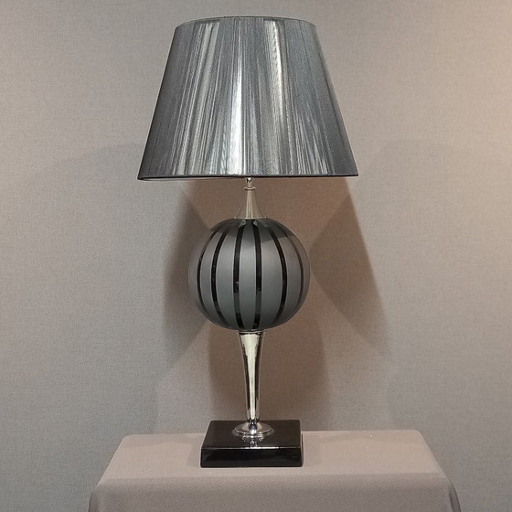 Discover this elegant Venetian table lamp by the renowned master Luigi Greco, a beautiful example of Italian craftsmanship and design. The lamp is entirely handmade in Venice by master potters and exudes authenticity and luxury. The ceramic base is finished with refined silver-colored details, which, together with the glossy black satin lampshade, create a timeless and luxurious appearance.