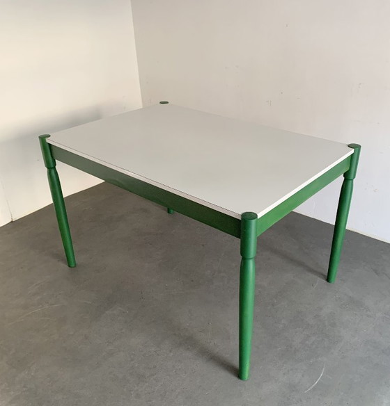 This Italian dining table from the 1970s brings a touch of retro charm to any dining space. Its striking green legs contrast beautifully with the sleek white Formica tabletop, creating a vibrant yet elegant look.