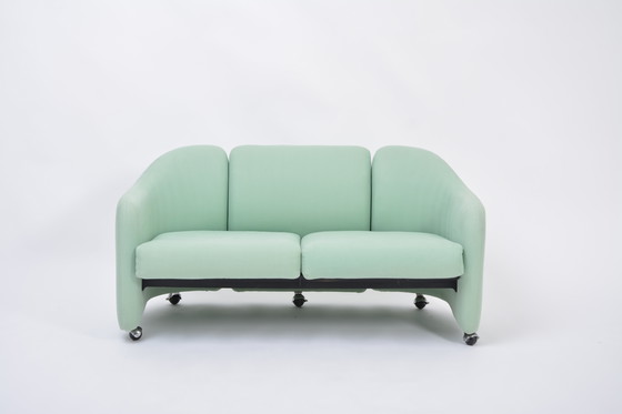 Italian mid-century modern two-seater sofa by Eugenio Gerli for Tecno, 1966. Two-seat sofa on wheels, model D142, from the 142 series or the Clamis series, designed by Eugenio Gerli in 1966 and produced in Italy by Tecno. The sofa has an internal metal structure which is padded with polyurethane foam and covered in light green fabric. Beautiful organically shaped form which works well in domestic and working environments. Out of production, unlike the armchairs still produced by Tecno.
