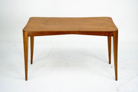 The gently curved frieze is complemented by four slender, tapered legs set at a slight angle, creating a sense of lightness and balance. The proportions and sculptural detailing recall the refined design language of Paolo Buffa. Good vintage condition with minor signs of age and use consistent with time. Some small restorations have been professionally carried out.