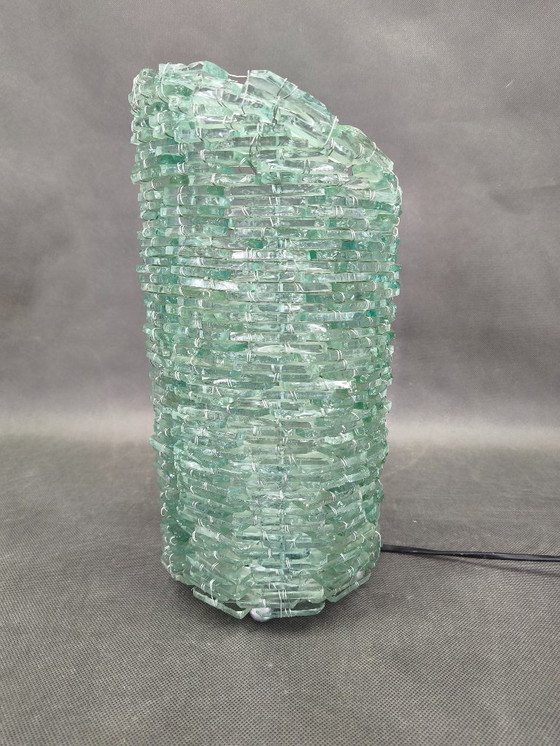 The lamp is constructed from stacked pieces of textured green glass wired together over a metal frame, forming a cylindrical architectural structure. The layered glass elements create a rich atmospheric light effect as illumination passes through the irregular glass surfaces.