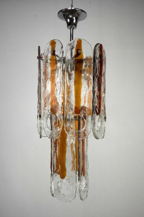 The chandelier features hand-blown, thick textured glass panels (plates) with a distinctive circular "eye" (Occhio) cutout at the bottom. Each clear glass element is enriched with a warm, central amber melt that creates a magnificent glow when illuminated.