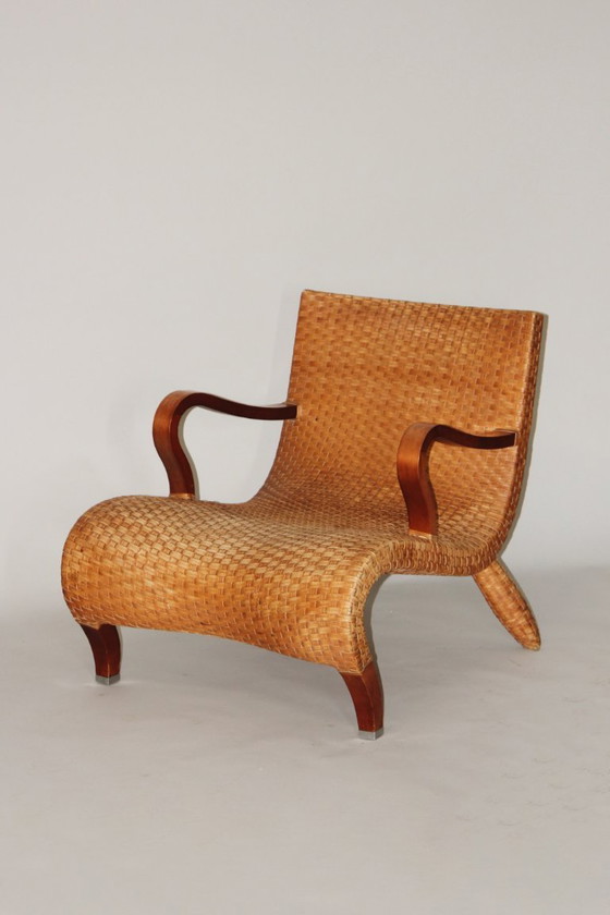 Woven leather lounge chair designed by Antonio Citterio for B&B Italia, Italy, 1970s. The chair combines a solid wooden structure with handwoven leather straps, creating a relaxed yet structured seating experience.