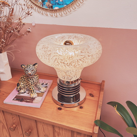 Such a great piece! Mouth-blown Murano glass on a chrome base with a modern look. The shape looks like a mushroom, with a donut-like form on top. When paired with a mirrored bulb that slightly sticks out, it creates a nice light effect. The subtle speckles and stripes in the glass add to the magic.
