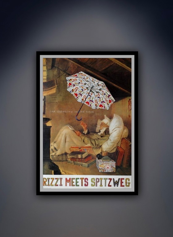 This poster was designed by James Rizzi in 1995 for the benefit of the New Pinakothek in Munich. Carl Spitzweg was a well-known humorous romantic painter. The work "The Poor Poet" depicts a poor poet lying on a mattress in a nonetheless shabby attic room. Numerous details in this work tell the whole story of this poor poet. James Rizzi took this humor and replaced the umbrella with a "Rizzi umbrella" and also integrated his "CONEY ISLAND" can and a Rizzi book into the work.