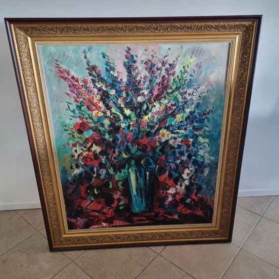 This beautiful painting by Jan Makkes captures the essence of expressive floral art in a vibrant color palette. The dynamic brushstrokes and rich textures bring an explosion of color to life, making the work a striking focal point in any room.