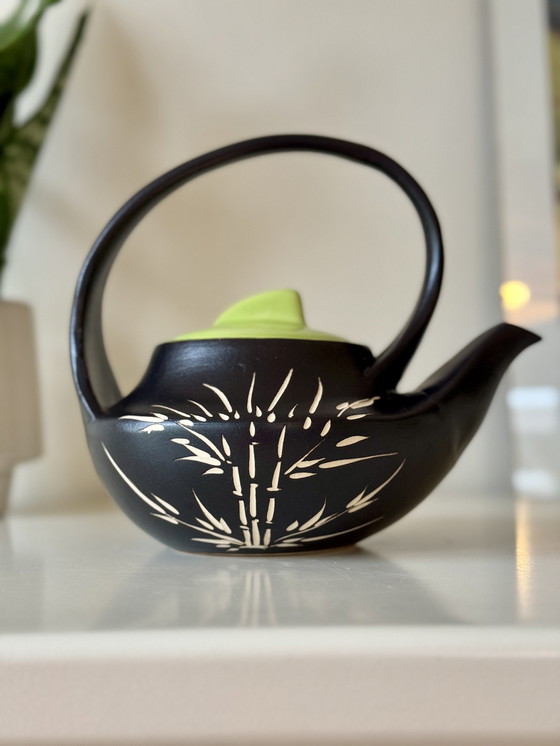 Atmospheric Japanese-style ceramic teapot handmade in Bat Trang (Vietnam), a village known for centuries for its high-quality ceramics. The exterior is dark brown and matte, with a fine engraving of bamboo. The lid and inside are covered with a bright green glaze that contrasts beautifully with the earthy brown.