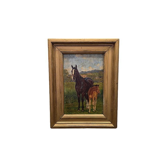 Jean van Marcke de Lummen (1797-1849) mare with foal, dating from the early 1800s. Charming and small decorative oil painting on panel depicting a mare with a foal. Signed in the lower left corner with Jean van Marcke; he was a Belgian painter born in Brussels and died in Liège. He was part of a well-known family of artists. For instance, he was the father of the famous cattle painter Émile van Marcke. Other family members, such as Edouard Jean van Marcke, were also active as artists. The painting is somewhat soiled and has developed craquelure over the centuries.