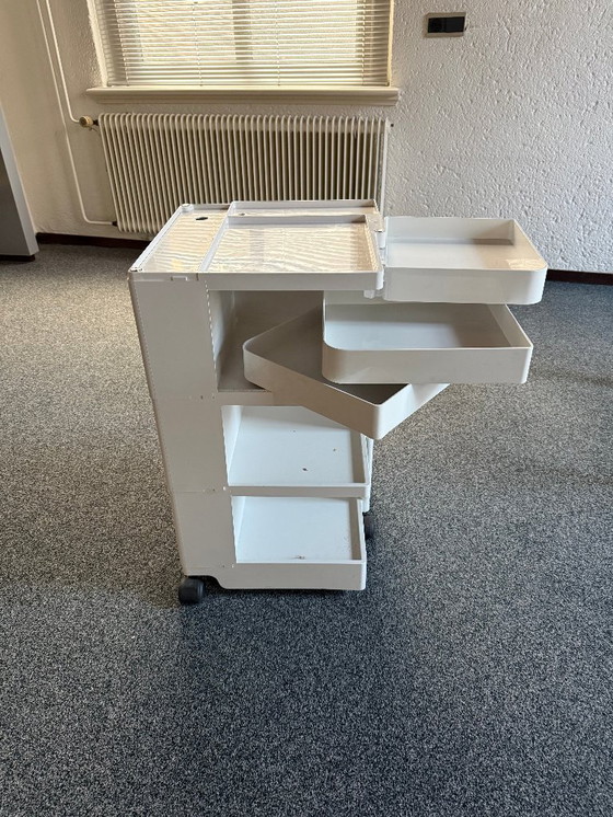 The famous Joe Columbo trolley. NOT DISCOLORED! Photo 3 shows a hole drilled in it (with a piece of wood for reinforcement, for a lamp).