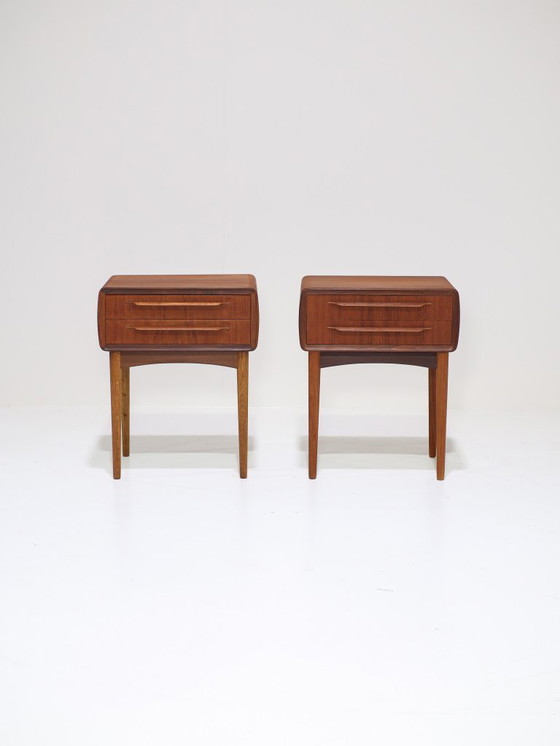 Rare pair of bedside tables designed by Johannes Andersen for Silkeborg Møbelfabrik, Denmark, 1960s. The tables are made of teak and each has two drawers with beautiful long handles. The design is timeless and elegant, with organic shapes and refined details in the edges. Pure craftsmanship!