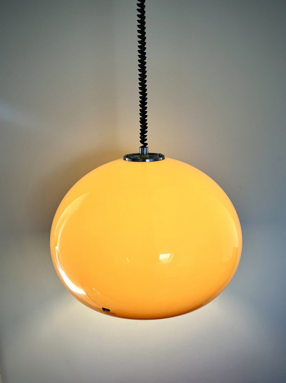 Luigi Massoni for Harvey Guzzini "Jolly" pendant lamp. In very good condition. No damage. Provides a beautiful warm, diffused light. A true 60s/70s vintage look, yet still modern. Equipped with the original suspension mechanism, allowing the lamp to be easily adjusted to the desired height.