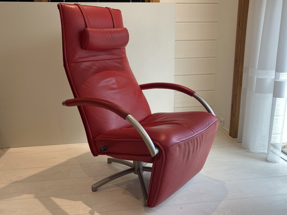 The recliner Jori Mensana, size Medi, mono move version, infinitely adjustable with lever. Design Pierre Audebert is executed in original full grain leather, beautiful red color Celia Cherry. Includes pillow in the same red leather color. The 5 toe foot is brushed stainless steel, as well as the armrests. The chair has wonderful seating and reclining comfort.