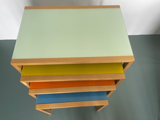 The tables are manufactured in Germany by an experienced workshop with careful craftsmanship and durable finishes. The glass tops are coloured on the underside to preserve depth.
