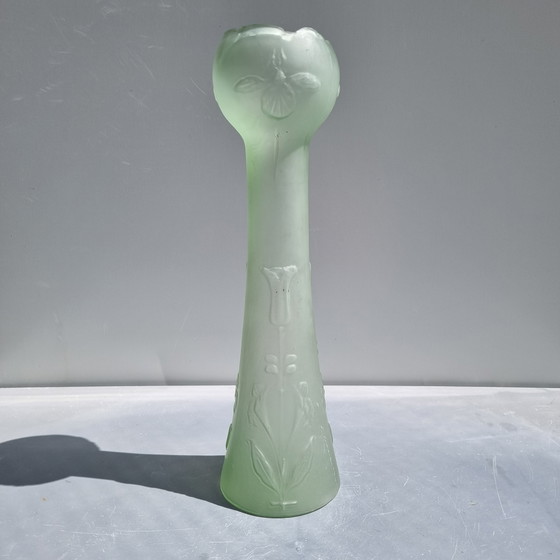 Lovely floral decorated bohemian light green frosted glass Pepita vase.