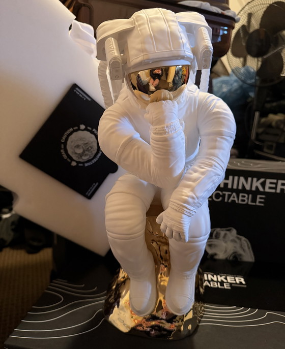 Introducing "The Thinker" by Joseph Klibansky, a striking modern sculpture that seamlessly blends contemporary design with a touch of whimsy. This piece features an astronaut deep in thought, elegantly poised on a gleaming golden base, creating a captivating contrast against the pristine white of the suit.