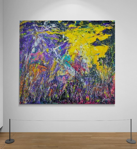 In this work, I unleashed my deepest emotions, allowing bold colors and powerful strokes to intersect in a dynamic dance. The chaos creates a sense of harmony, symbolizing the vibrant tension between the earthly and the divine. This painting evokes a sense of well-being and relaxation. The work is painted with acrylic paint on XXL canvas. The paint has been applied expressively and dynamically to the canvas in several layers with a large palette knife and homemade spatulas. Varnished and includes a certificate of authenticity. The dynamism, expressiveness, and freedom of the artist's artistic expression are clearly visible.