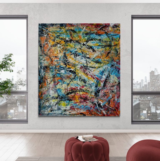 Unique large abstract expressionist painting with a total large canvas size (with extra white borders) of 120 x 105 x 01 cm. The work was painted in 2026. The painting will be shipped rolled up, without a stretcher frame. Once mounted on the frame, the canvas size (image) is: 110 x 95 x 2 cm.