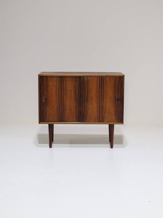 Beautiful sideboard, model 41, designed by Kai Kristiansen for FM / Feldballes Møbelfabrik in Denmark in the 1960s. This sliding-door cabinet is made of rosewood with a beautiful grain. The cabinet stands on tall legs and has two sliding doors with attractive round handles. Inside, there's a height-adjustable shelf and three drawers. It's also ideal as an LP or record cabinet!