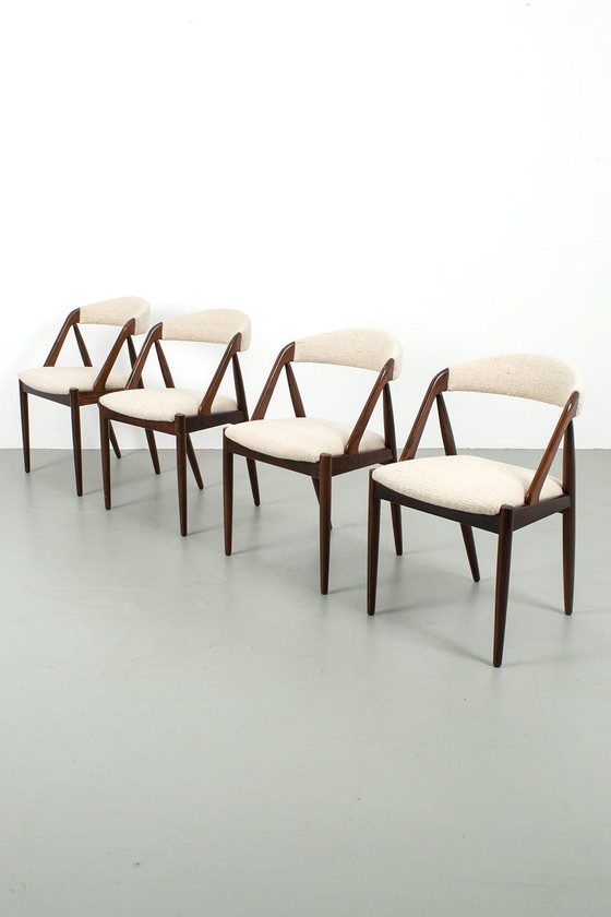 Kai Kristiansen model 31 chairs, designed in the 1960s for Andersen Møbelfabrik in Denmark. This rosewood version still has the original, high-quality wool upholstery, which is in excellent condition. The price is per set, and all chairs are in good vintage condition.