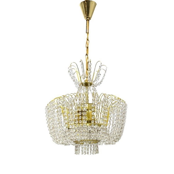 Kamenický Šenov Crystal Chandelier — gilded brass, cut crystals (glass crystal), 6 E14 bulb sockets. The structure features a two-tiered cascade: the upper section is composed of radially arranged brass arches with suspended crystal garlands, the middle section is basket-shaped with a dense curtain of crystal chains, and the lower section has a circular crystal finial. The gold-plated brass frame and clear, cut crystals refract the light, creating striking reflections. Kamenický Šenov (Kamenný Šenov, German: Steinschönau) is the historic center of glass and crystal production in northern Bohemia, renowned for its high-quality glass and crystal products since the 18th century. Dimensions: height 78 cm, diameter 58 cm. Czechoslovakia, 1960s/1970s. 20th century. Very good condition, complete.