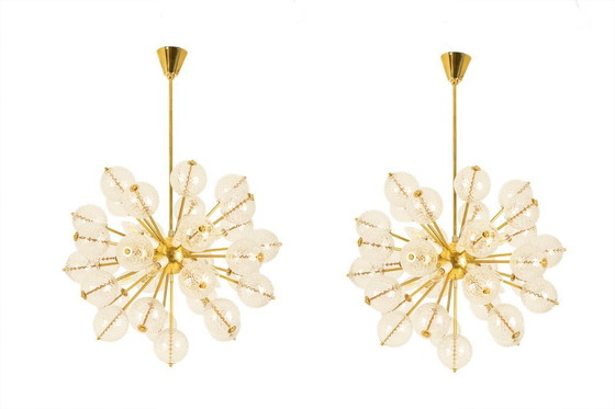 Pair of 10-light Sputnik-style chandeliers in brass with blown glass globes.