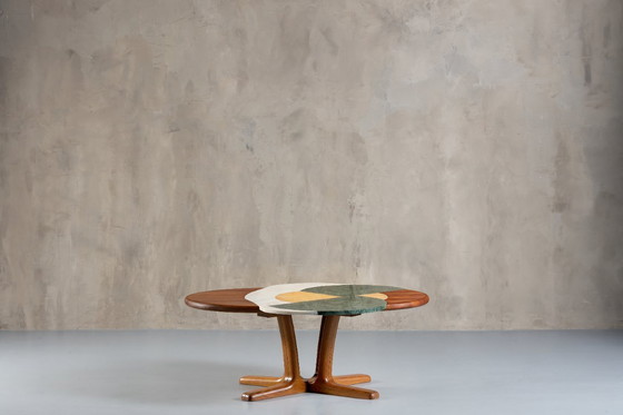 This coffee table is a true celebration of natural materials, featuring a teak base that offers a rich contrast to the green, yellow, and white marble insertions that create a mesmerizing interplay of colors and patterns. The marble's fluid and graceful movement resembles an egg, imbuing the table with an ethereal quality that enchants the eye.