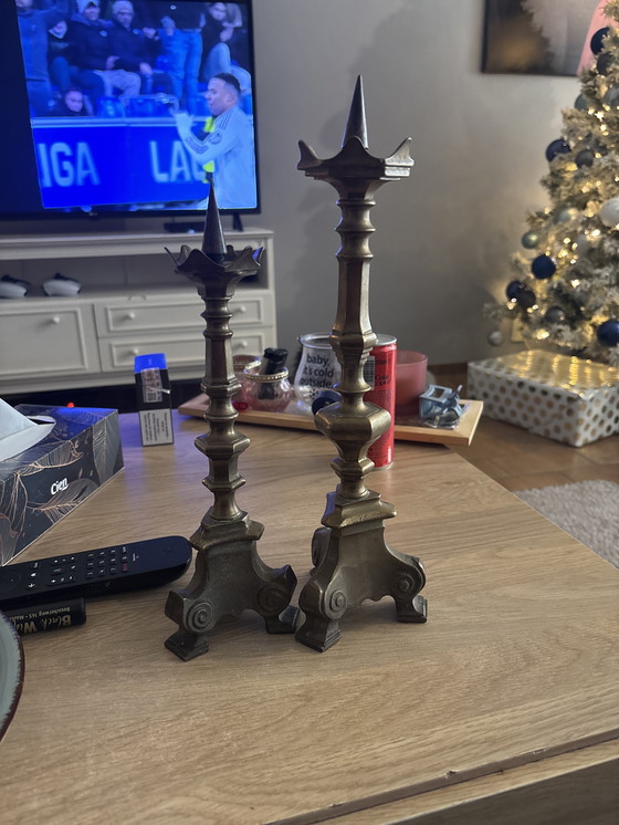 These 19th-century brass candlesticks exude vintage charm with their intricate design and sturdy craftsmanship. Perfect for adding a touch of historical elegance to any room, they stand as a testament to timeless style.