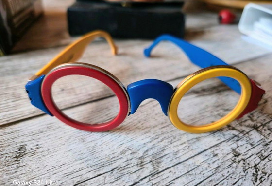 - The eye-catching combination of red, blue, and yellow gives these glasses an unmistakable look.