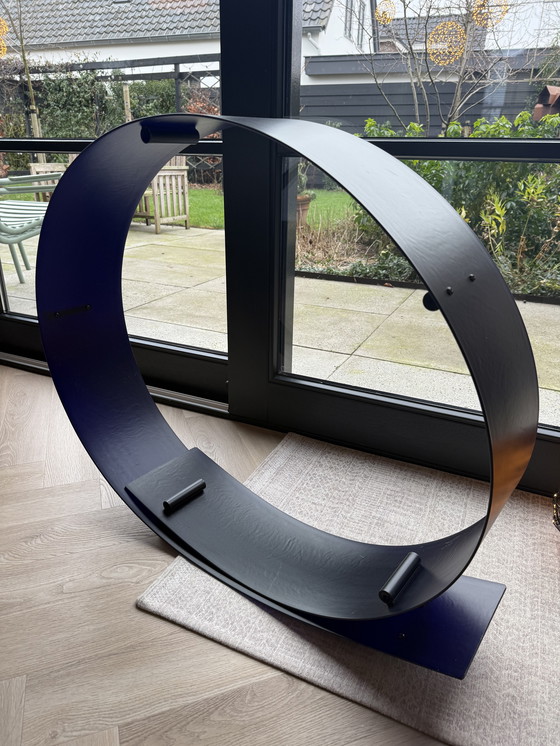 Bookworm wall shelf from Kartell. Purple/dark blue plastic, slightly transparent, and equipped with 7 bookends. You can customize the shape. Make it a wave or a C-shape! It's a very sturdy, rigid material. It can hold a considerable weight without deforming. Suitable for storing (medium-sized) books, CDs, or other decorative items. A design classic!