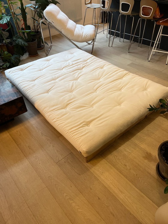 This cream-colored futon, with its minimalist design, blends seamlessly into any modern interior, adding a touch of sophistication and comfort. It's very practical and comfortable for sleeping.