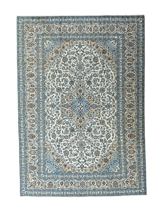 A magnificent, large-format Kashan rug made from fine cork wool. The classic medallion design in delicate shades of blue, beige and cream looks particularly sophisticated and creates an elegant atmosphere in any room. Finely knotted with detailed floral ornaments and an ornate frame.